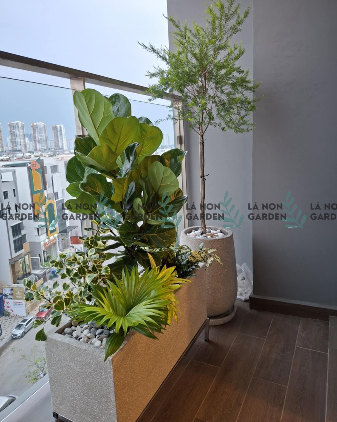 1 chậu cây lẻ phối với 1 bồn cây dài